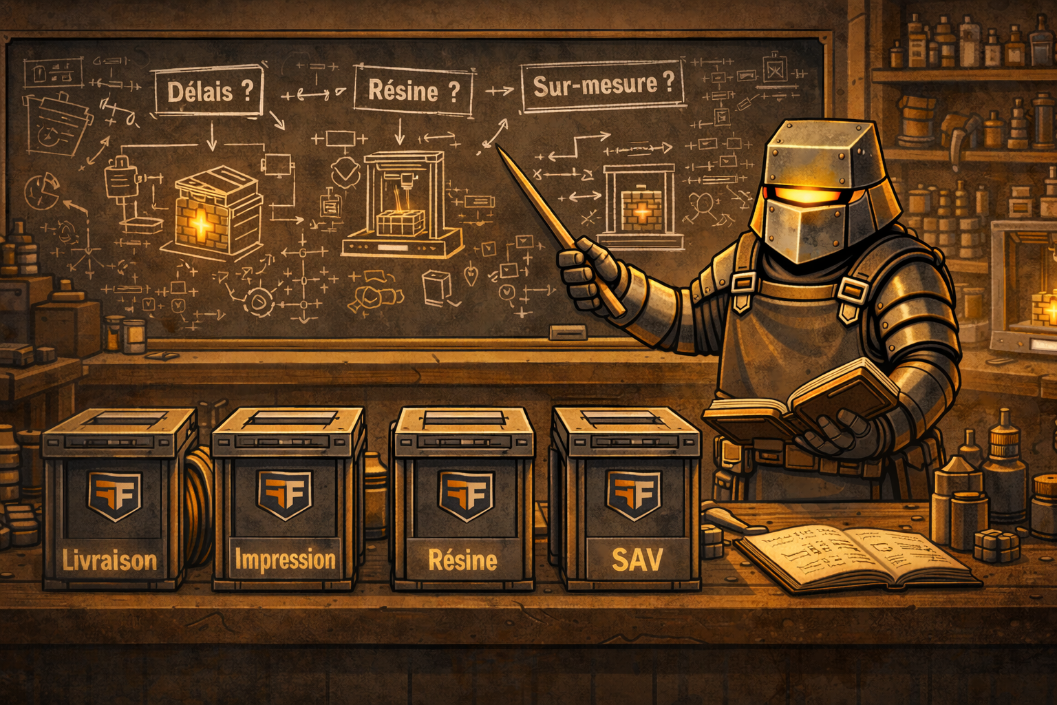 Les décors Forge Factory sont imprimés en résine 3D haute définition, en petites séries, avec un niveau de détail et une modularité pensés pour le jeu.